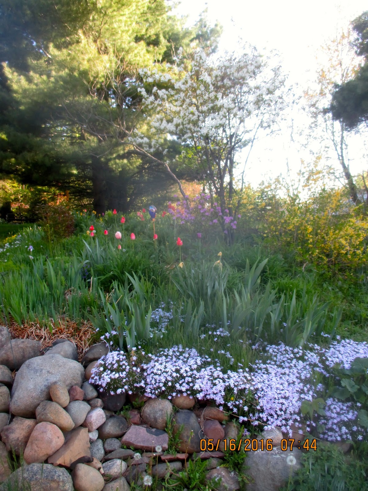 | JUNEBERRY, FORSYTHIA, PJM RHODODENDRON, TULIPS, CREEPING PHLOX ALL IN BLOOM |